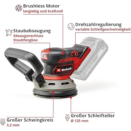 Thông tin sản phẩm Einhell Professional Cordless Random Orbital Sander TP-RS 18/32 Li BL-Solo Power X-Change (18 V, Brushless, 3.2 mm Oscillating Circle, 125 mm Sanding Disc, Including Sandpaper, Without Battery)