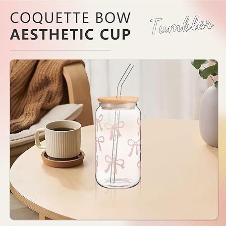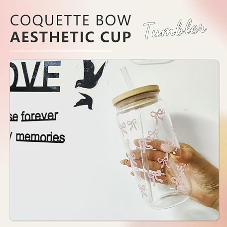 Sản phẩm Elegant 16 oz Glass Tumbler with Lid and Straw, Coquette Bow Design, Versatile for Coffee, Cocktails and More đang được bán với giá ưu đãi là $13.8103 tại nước Đức.