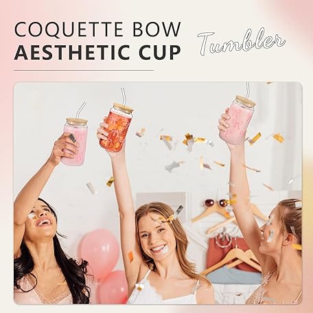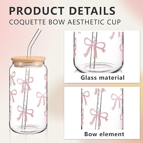 Thông tin sản phẩm Elegant 16 oz Glass Tumbler with Lid and Straw, Coquette Bow Design, Versatile for Coffee, Cocktails and More