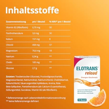 Sản phẩm ELOTRANS reload - isotonic electrolyte glucose mixture - dietary supplement with magnesium, potassium chloride, choline and B vitamins - 1 x 15 bags đang được bán với giá ưu đãi là $13.3743 tại nước Đức.