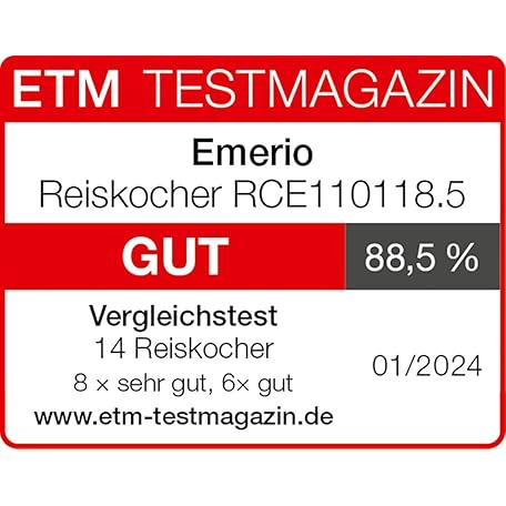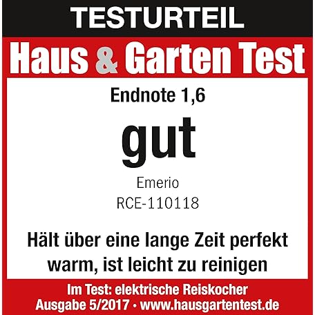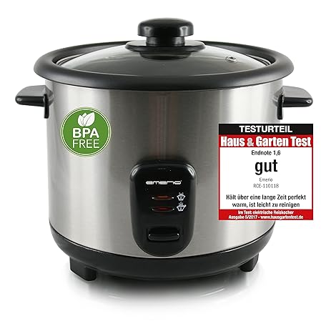 Sản phẩm EMERIO automatischer Eco Reiskocher | 1.5L Volumen | Warmhaltefunktion | Auto Off | Antihaftbeschichtung | Glasdeckel | inkl Reislöffel + Messbecher | Schongarer | 500 Watt | Edelstahl | RCE-110118.5 đang được bán với giá ưu đãi là $31.9261 tại nước Đức.