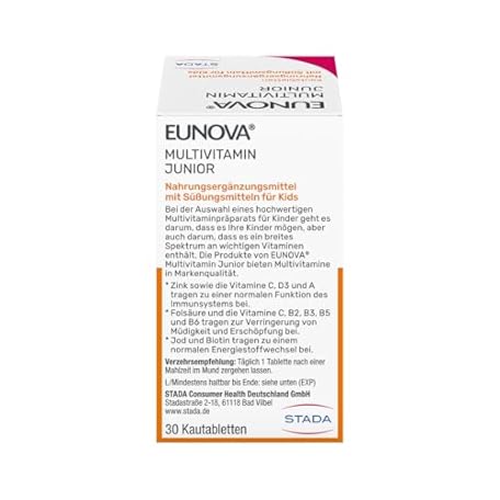 Thương hiệu Eunova là cái tên nổi tiếng được rất nhiều khách hàng trên thế giới chọn lựa. Với kiểu dáng đẹp mắt, sang trọng, sản phẩm EUNOVA Junior - Multivitamin Kautabletten mit 12 Vitaminen und wichtigen Mineralstoffen - Nahrungsergänzungsmittel für Kinder ab 4 Jahren - 1 x 30 Stück là sự lựa chọn hoàn hảo nếu bạn đang tìm mua một món cho riêng mình.