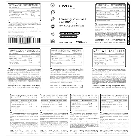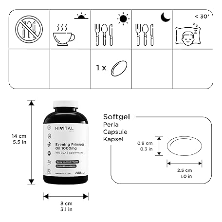 Sản phẩm Evening Primrose Oil 1000 mg with 10% Omega 6 GLA. 200 beads of cold-pressed natural oil. For a treatment of more than 6 months. Contains 10% GLA and Vitamin E. Made by HIVITAL đang được bán với giá ưu đãi là $29.0594 tại nước Đức.