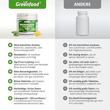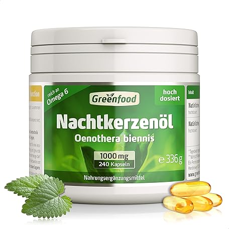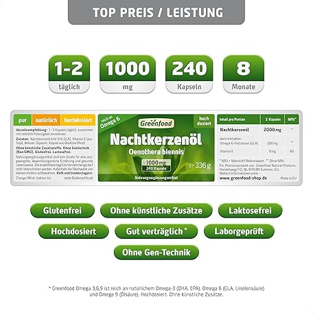 Sản phẩm Evening Primrose Oil Capsules, High Dose, 1000 mg - 240 Softgels. Rich in Omega-6 (GLA) and Natural Vitamin E (Cell Protection). No Artificial Additives - Laboratory Tested Greenfood. đang được bán với giá ưu đãi là $50.8158 tại nước Đức.