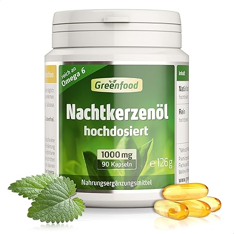 Evening Primrose Oil Capsules, High Dose, 1000 mg, 90 Softgels. Rich in Omega-6 (GLA) and Natural Vitamin E (Cell Protection). Without Artificial Additives, Laboratory Tested. Greenfood.