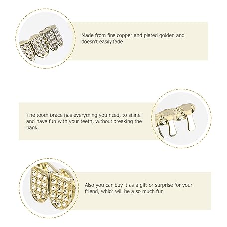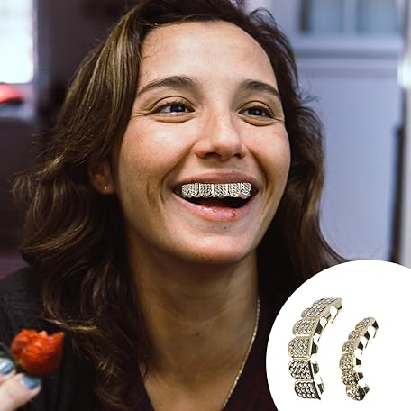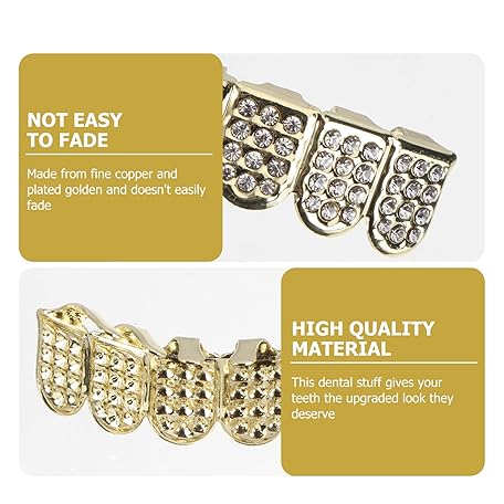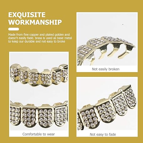 Sản phẩm EXCEART Hip Hop Teeth Grills Fake Punk Hip Hop Teeth Mouth Top Bottom Diamond Rhinestone Teeth Grillz Halloween Music Festival Party Hip Hop Rapper Costume Accessory Decoration Ornament Golden đang được bán với giá ưu đãi là $13.8757 tại nước Đức.