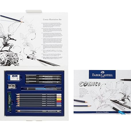 FABER-CASTELL 167195 Pitt Artist Pen Comic Illustration Set, 3 Ink Pens, 3 Watercolour Pencils and Accessories, 15 Pieces