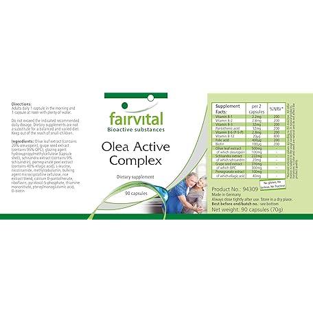 Thông tin sản phẩm Fairvital Olea Active Complex – 90 Capsules – Vegan – Combination of B Vitamins, Folic Acid, Olive Leaf, Schisandra, Pomegranate and OPC
