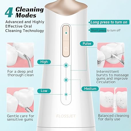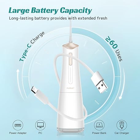 Thông tin sản phẩm FlossJet Wireless Oral Irrigator, White, Portable IPX7 Waterproof Oral Irrigator for Teeth Cleaning and Braces Care, 4 Modes, 5 Nozzles, 300 ml, Water Tank, Water Flosser, USB-C Quick Charge,