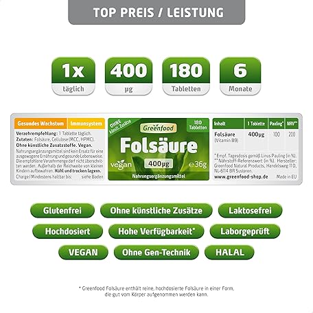 Thương hiệu Greenfood là cái tên nổi tiếng được rất nhiều khách hàng trên thế giới chọn lựa. Với kiểu dáng đẹp mắt, sang trọng, sản phẩm Folic Acid, 400 mcg, Vegan Hochdosiert Tablets – For Blood Education and Pregnancy For Cell Growth and Recovery, 1x A Child. No Artificial Additives. GM Free., , , là sự lựa chọn hoàn hảo nếu bạn đang tìm mua một món cho riêng mình.