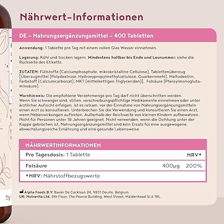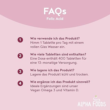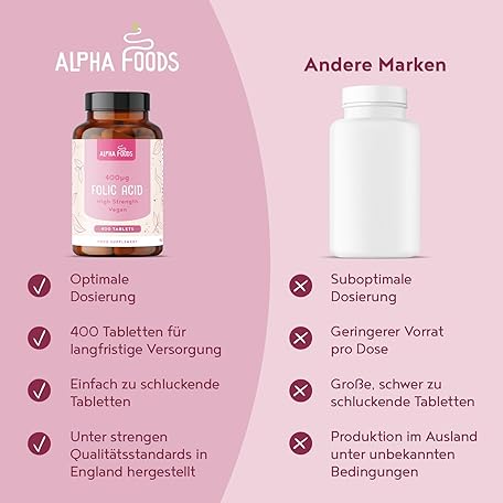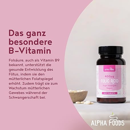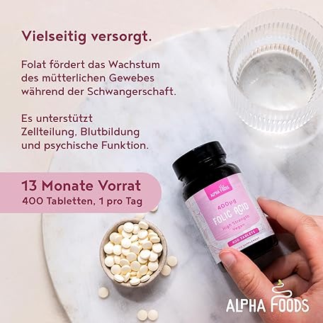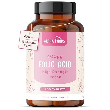 Sản phẩm Folic Acid, 400 Tablets, 400 mcg per Tablet, Pregnancy and Desire for Children, 100% Vegan, High Dose, No Unnecessary Additives Alpha Foods đang được bán với giá ưu đãi là $12.5568 tại nước Đức.