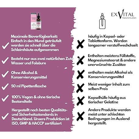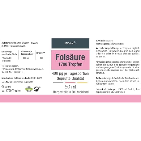 Thông tin sản phẩm Folic Acid Drops, 400 µg per Daily Dose – 50 ml Bottle, Pregnancy & Immune System – 100% Vegan, No Additives & Laboratory Tested Made in Germany