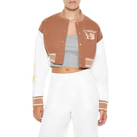 Thông tin sản phẩm Forever 21 Damen Cropped Letterman Jacket Bomber, Jacke, Varsity, Camel, S