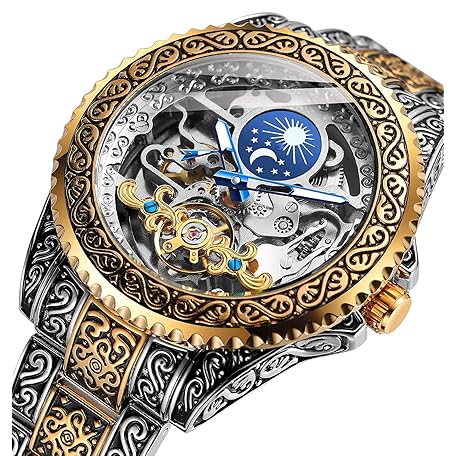 Thông tin sản phẩm FORSINING Retro Men's Carved Self Winding Mechanical Tattoo Tourbillon Moon Phase Independent Second Skeleton Automatic Large Dial Wristwatches Gold, gold, Bracelet