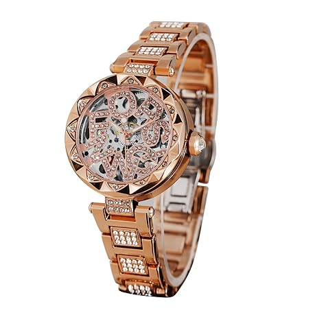 FORSINING Women Automatic Watch Letter Design Diamond Movement Mechanical Skeleton Watch (Rose Gold)