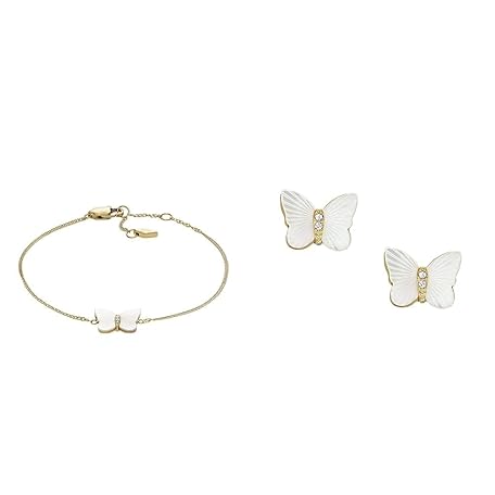 Fossil Armband für Frauen,Weißes Perlmutt,Länge:169mm+32mm,Breite: 13.2mm, Höhe:10mm, JF04425710+Ohrringe für Frauen Radiant Wings Weiß Perlmutt Ohrstecker Schmetterling,:7mm,Breite: 9.7mm,