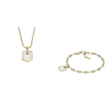 Fossil Damenkette Halskette und Kettenarmband - Heritage Crest Perlmutt, goldfarbene Edelstahl-Halskette und goldfarbenes Messingarmband
