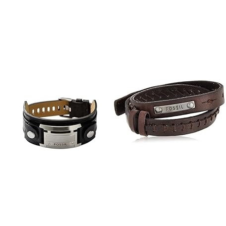 Fossil JF87354040 Large Black Leather ID Cuff Bracelet, Length: 242 mm, Width ID: 29 mm & Men's Double Wrap Bracelet in Brown, Stainless Steel