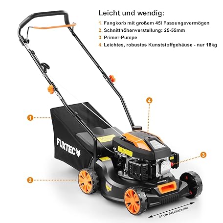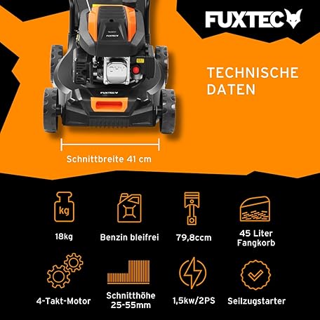 Thông tin sản phẩm FUXTEC Petrol Lawn Mower FX-RM4180, Garden Mower for Small Areas, 80 cc 4 Stroke Mower, 40 cm Narrow Cutting Width, 45L Grass Catcher Basket, Robust Construction and Lightweight