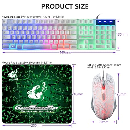 Thông tin sản phẩm Gaming-Tastatur und Maus-Set, 104 Tasten Rainbow Backlit QWERTY UK Layout-Tastatur + 2400 DPI 4 Tasten Atemmaus + Mauspad-Kombination, USB-Kabel Kompatibel mit PS4 Xbox (Need Adapter) Weiß