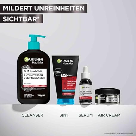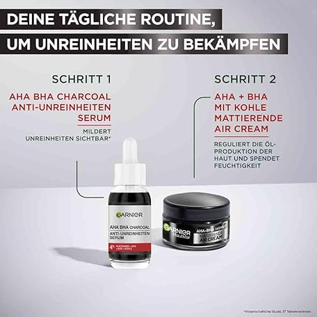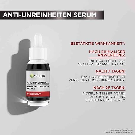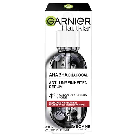 Thông tin sản phẩm Garnier AHA + BHA Serum, Salicylic Acid, Charcoal & 4% Niacinamide Serum, Face Care Against Impurities, Reduces Blackheads & Visible, for Even & Smooth Skin, Skin Clear, 30 ml