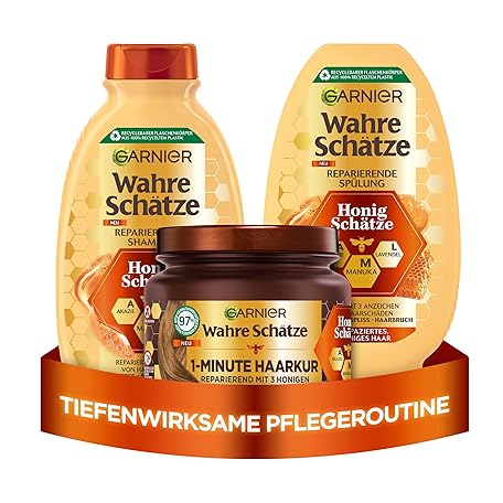 Sản phẩm Garnier True Treasures Acacia Honey Manuka Lavender Honey Treasures Shampoo 250ml Conditioner 200ml 1 Minute Hair Treatment 340ml đang được bán với giá ưu đãi là $11.4123 tại nước Đức.