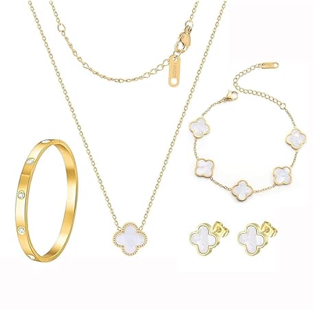 Generisch 18K Gold-Plated Four Leaf Clover Bracelet, 18K Gold-Plated Four Leaf Clover Pendant Necklace, Gold Bracelet Cubic Zirconia Bangle, 4 Pieces Jewellery Set for Birthday Gifts