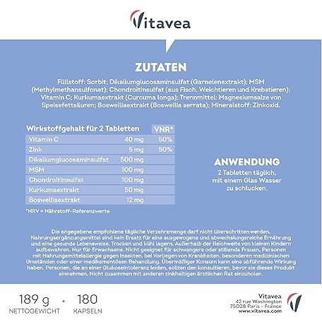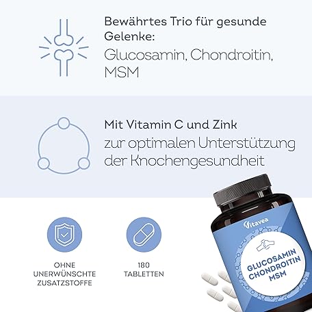 Sản phẩm Glucosamine Chondroitin MSM - 180 Tablets - With Vitamin C, Zinc, Boswellia - For Bones, Cartilage, Collagen Formation - Joint Capsules - Laboratory Tested, No Additives - Vitavea đang được bán với giá ưu đãi là $23.2606 tại nước Đức.