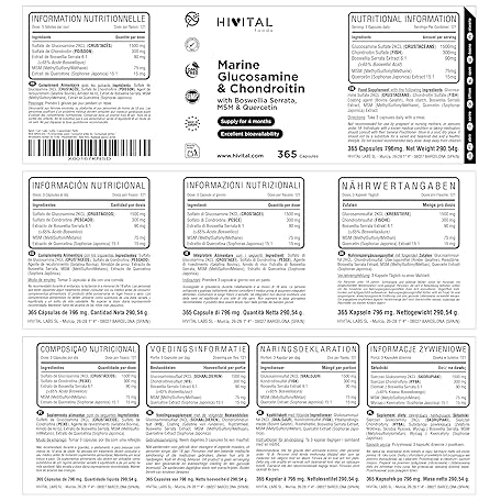 Thông tin sản phẩm Glucosamine with Chondroitin. 365 capsules for a 4 month treatment. With 1500 mg Marine Glucosamine 2KCL, Marine Chondroitin, MSM, Boswellia Serrata and Quercetin. Made by HIVITAL