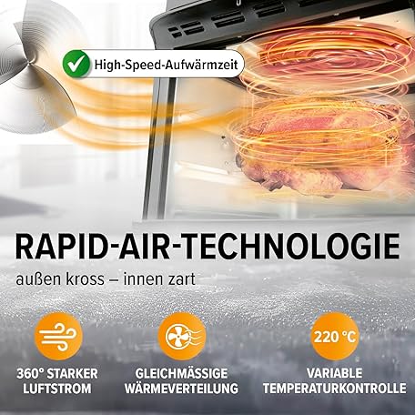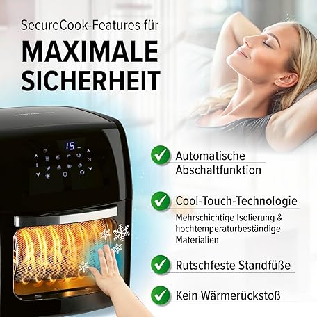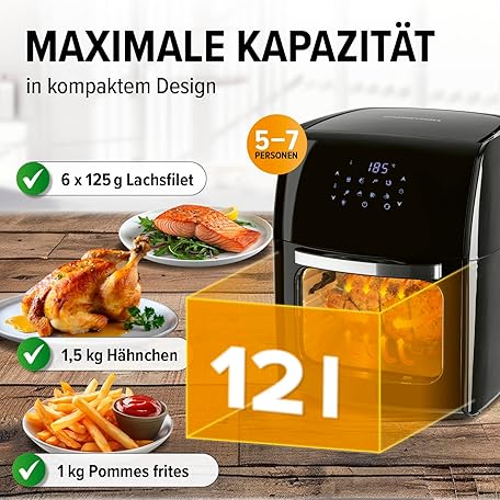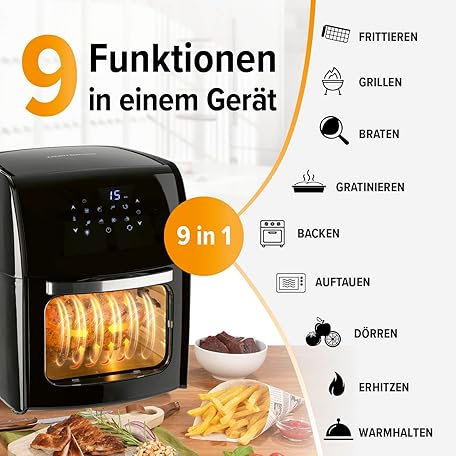 Thông tin sản phẩm GOURMETmaxx Digitale Heißluftfritteuse 12L XXL-Ofen | Airfryer mit Timerfunktion, Touchdisplay, Drehspieß & Backgitter | fettarm, energiesparend frittieren | 8 Programme, 1800 W