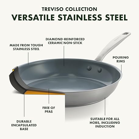 Thông tin sản phẩm GreenPan Treviso Stainless Steel Healthy Non-Stick Ceramic Frying Pans with Lid, 30 cm, PFAS-Free, Induction, Oven-Safe, Dishwasher Safe, Silver