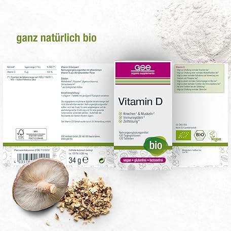 Thông tin sản phẩm GSE Vitamin D Compact Tabletten, hochdosiertes Vitamin D, Sonnenscheinvitamin, 100% vegan und ohne Zusatz, BIO-Qualität, 120 Stück
