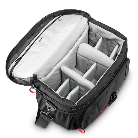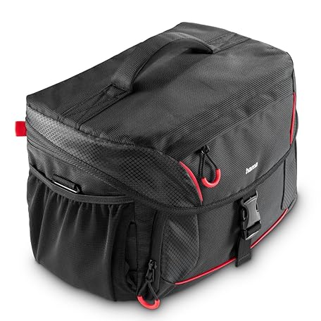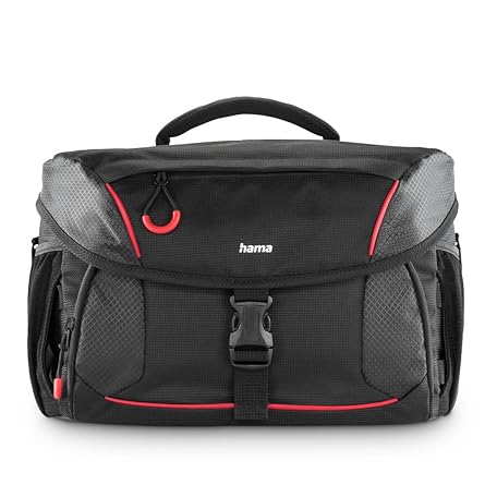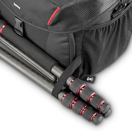 Hama Camera Bag for Digital SLR and System Cameras with Accessories, Holder for Camera Tripod, Tablet Compartment, Rain Cover, Padded, Carry Handle, Trolley Strap, Wipe-Clean Base, Black, red, Modern