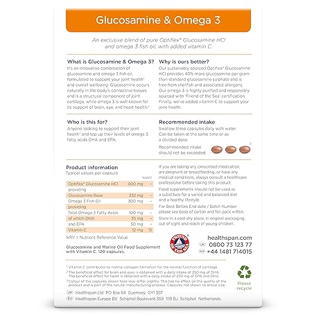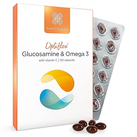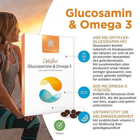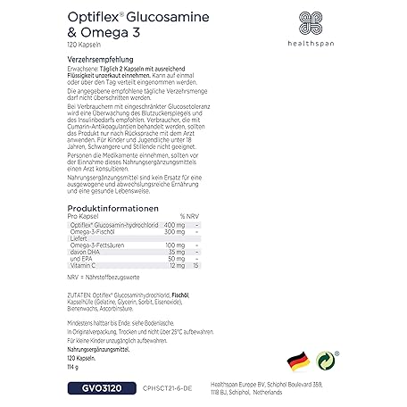 Sản phẩm Healthspan Glucosamine & Omega 3 Joint Health Additional Vitamin C 400 mg Optiflex Glucosamine HCI 300 mg Omega 3 Fish Oil Highly Purified and Sustainably Grown 120 Capsules đang được bán với giá ưu đãi là $24.0345 tại nước Đức.