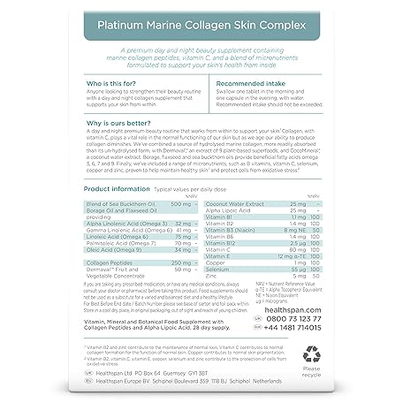 Thông tin sản phẩm Healthspan Platinum Marine Collagen Skin Complex (28-Day Supply) | High Quality Day & Night Preparation | Contains Marine Collagen Peptides, Vitamin C & Micronutrients | Supports Skin Health