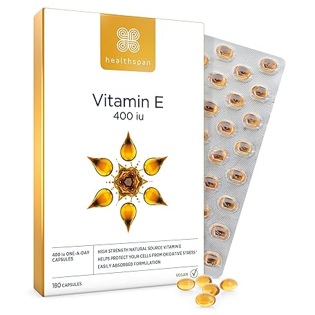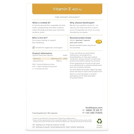 Thông tin sản phẩm Healthspan Vitamin E 400iu, Highly Effective Formula to Fight Cell Damage and Support Immune Health & Skin, High-Quality Antioxidant Support, Vegan, 180 Capsules
