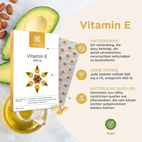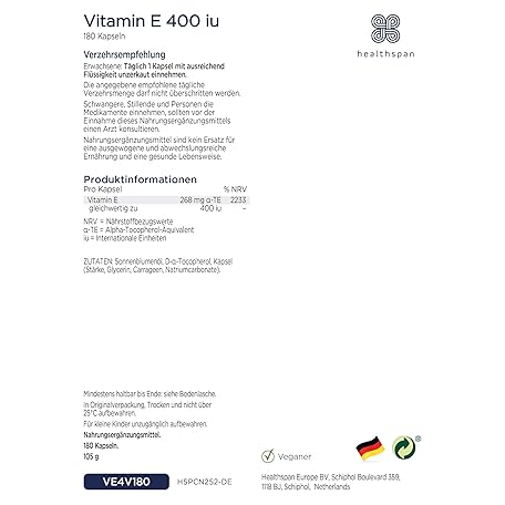 Sản phẩm Healthspan Vitamin E 400iu, Highly Effective Formula to Fight Cell Damage and Support Immune Health & Skin, High-Quality Antioxidant Support, Vegan, 180 Capsules đang được bán với giá ưu đãi là $34.2914 tại nước Đức.