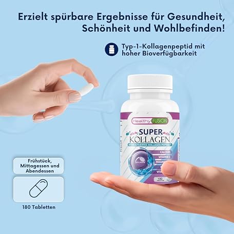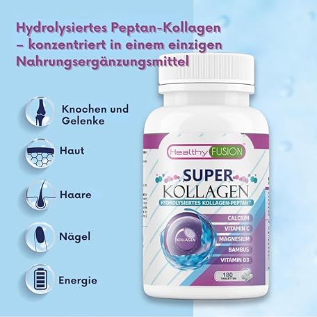 Sản phẩm Healthy Fusion Kollagen Hydrolysat Meereskollagen 3800mg Gesunde und mit Feuchtigkeit versehene Haut Schützt erleichtert Schmerzen der Gelenke Muskeln und Knochen, 180 tabletten đang được bán với giá ưu đãi là $25.4515 tại nước Đức.