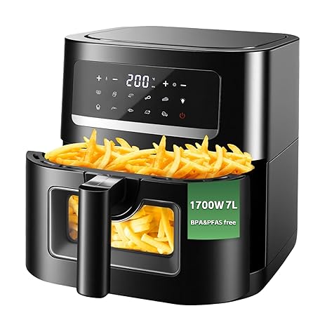 • Heißluftfritteuse 7L mit Sichtfenster & Touchscreen – Airfryer mit 10 Programmen, Aufheizfunktion, Innenbeleuchtung | Frittieren ohne Fett | BPA- & PFAS-frei