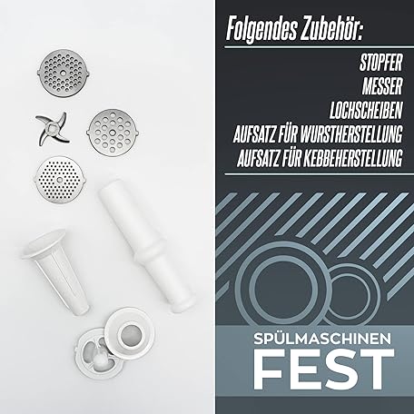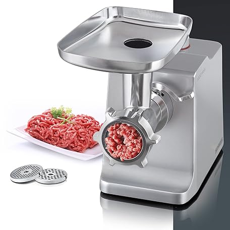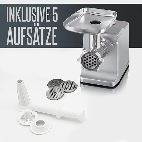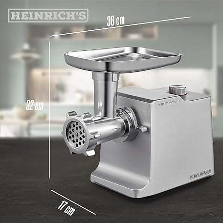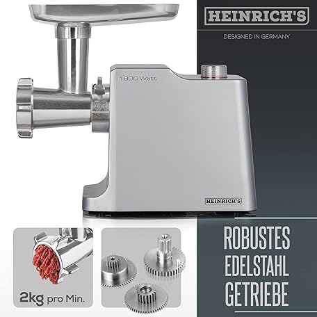 Thông tin sản phẩm Heinrich´s Electric Meat Grinder & Sausage Machine with 3 Different Chopper Sieves + Kebbe Attachment + Sausage Attachment + Tamper, 1800 W Motor, Professional Metal Gear, 2 kg/per min Meat Processing