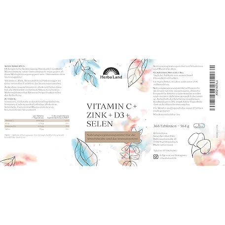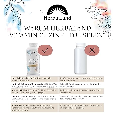Thông tin sản phẩm Herbaland® Vitamin C Zinc Selenium D3 Tablets, 365 Tablets for 1 Year, Vegetarian, Vitamin C 1000 mg, Zinc 10 mg, 500 IU Vitamin D3 & 55 µg Selenium, Laboratory Tested Quality, Made in Germany