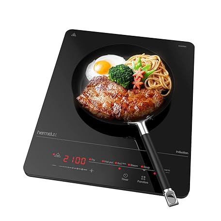 Hermitlux Induktionskochfeld 1 Platte – 6 Kochprogramme, 9 Leistungsstufen, Timer & Warmhaltefunktion – 2100 W tragbares Induktionskochplatte – kompakte Größe für Küche, Büro, Schwarz