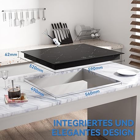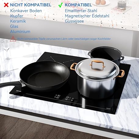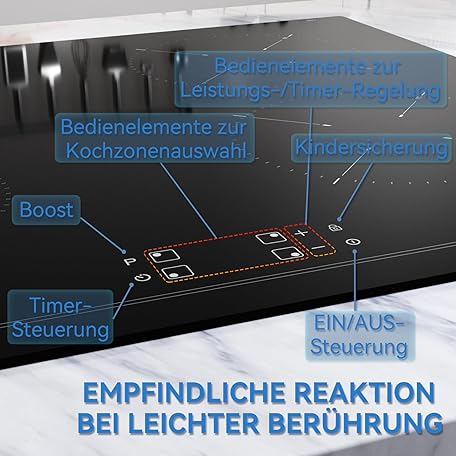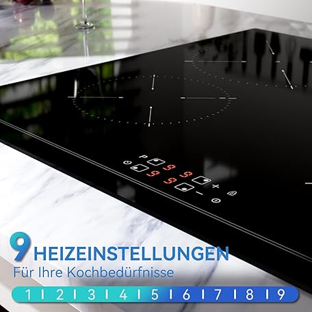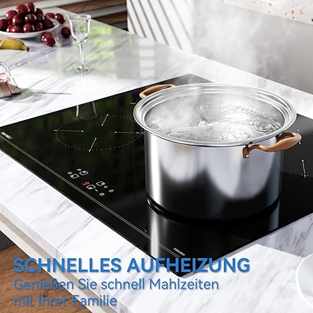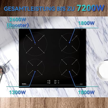 Thông tin sản phẩm Hermitlux Induktionskochfeld 60cm, Einbau Kochfeld 4 Zonen mit Booster, 9 Leistungsstufen, Touch-Bedienung, Kindersicherung und Timer, 7200W