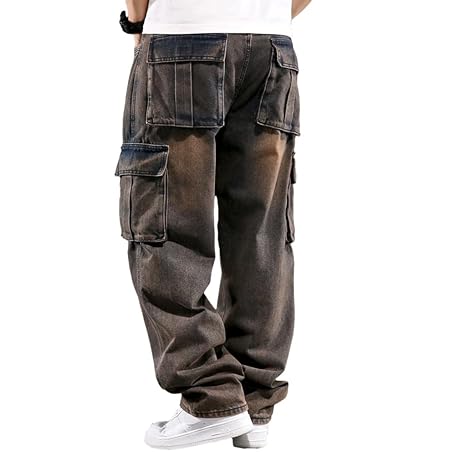 Herren-Jeans, lockere Passform, Hip-Hop-Jeans, leger, Cargo-Denim-Hose mit mehreren Taschen, gelb, 44