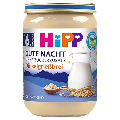 HiPP Organic Gute Nacht spelt semolina porridge (6 x 190 g), baby porridge from 6 months, without added sugar, well filling, in best organic quality