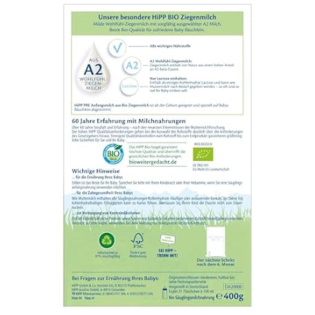 Thông tin sản phẩm HiPP PRE initial milk from organic goat milk (5 x 400 g), from birth, with GOS, only lactose, A2 beta casein, particularly easy to digest
