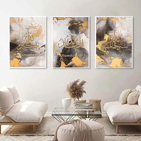 Thông tin sản phẩm HMDKHI Islamic Wall Picture Set, Islamic Pictures Golden Arabic Calligraphy Allah Wall Pictures Living Room Canvas Poster Art Prints Decor (3 Pieces - 40 x 60 cm, No Frame, Golden Abstraction)