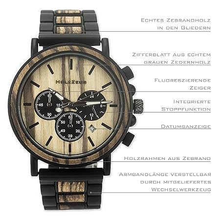 Thông tin sản phẩm HOLZZEUG Engraved Men's Wooden Watch with or without Engraving Watch with Personalised Engraving, Zebrawood, Bracelet