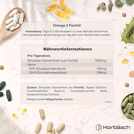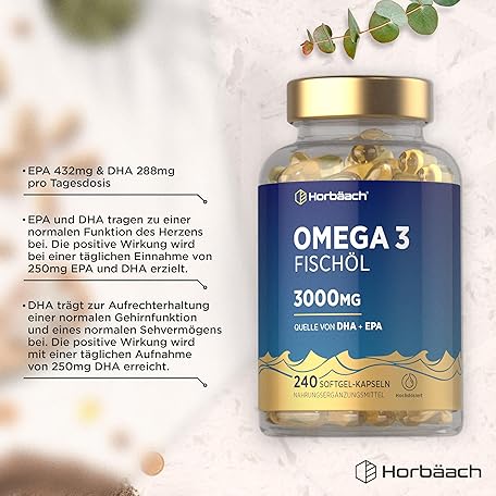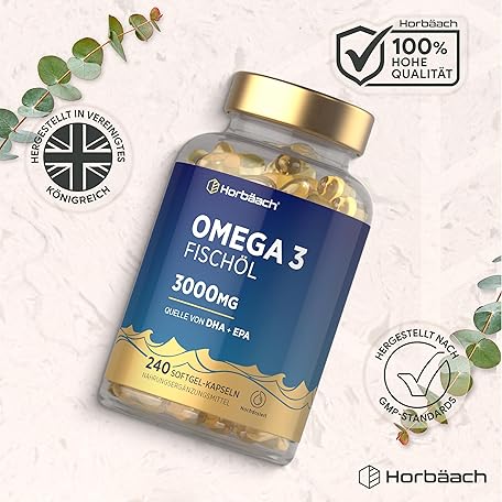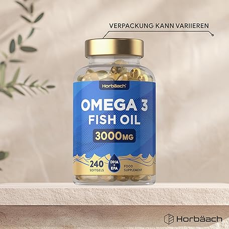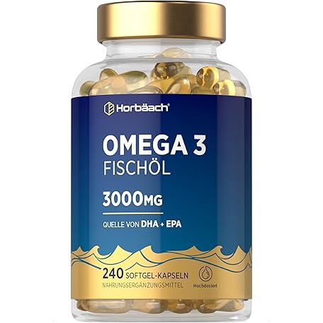 Sản phẩm Horbaach Omega 3 Capsules High Dose 3000 mg per Daily Dose Fish Oil Supplement with EPA and DHA, 1,000 mg Fish Oil per Capsule, Pack of 240 đang được bán với giá ưu đãi là $22.9554 tại nước Đức.