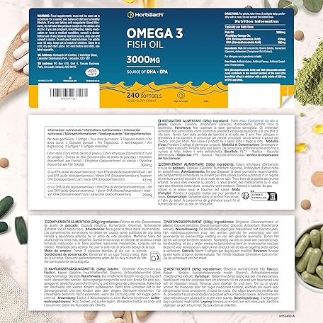 Thông tin sản phẩm Horbaach Omega 3 Capsules High Dose 3000 mg per Daily Dose Fish Oil Supplement with EPA and DHA, 1,000 mg Fish Oil per Capsule, Pack of 240